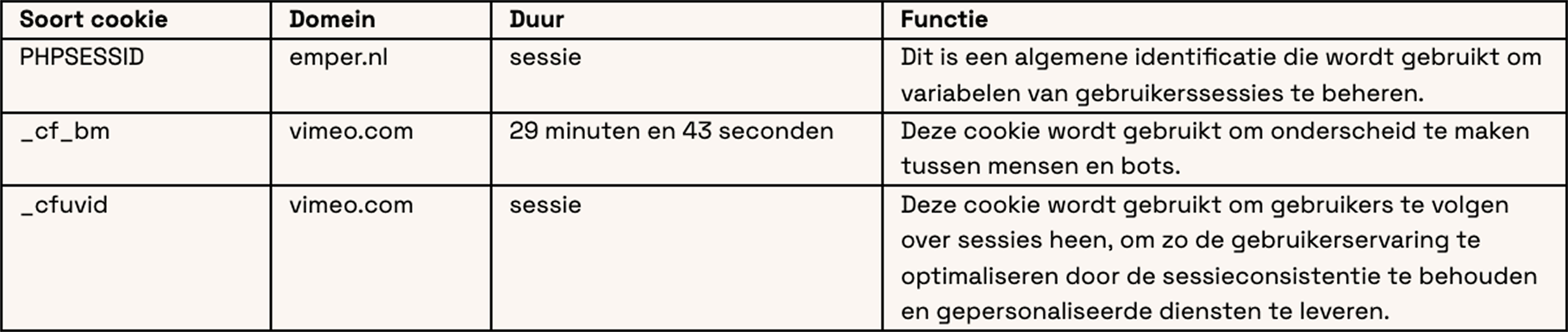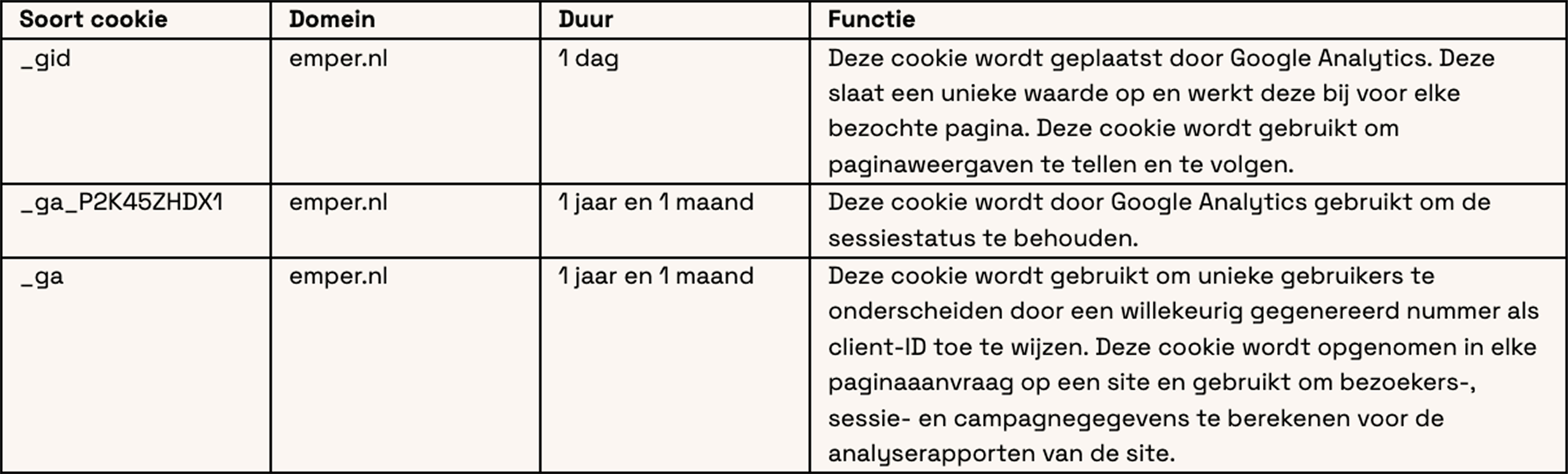 Een cookie is een eenvoudig, klein tekstbestand dat bij het eerste bezoek aan de website wordt meegestuurd en door de browser op de harde schijf van jouw computer, tablet of smartphone wordt opgeslagen. In deze bestanden wordt informatie opgeslagen die bij een later bezoek aan de website weer kan worden herkend. Emper gebruikt de volgende cookies:
